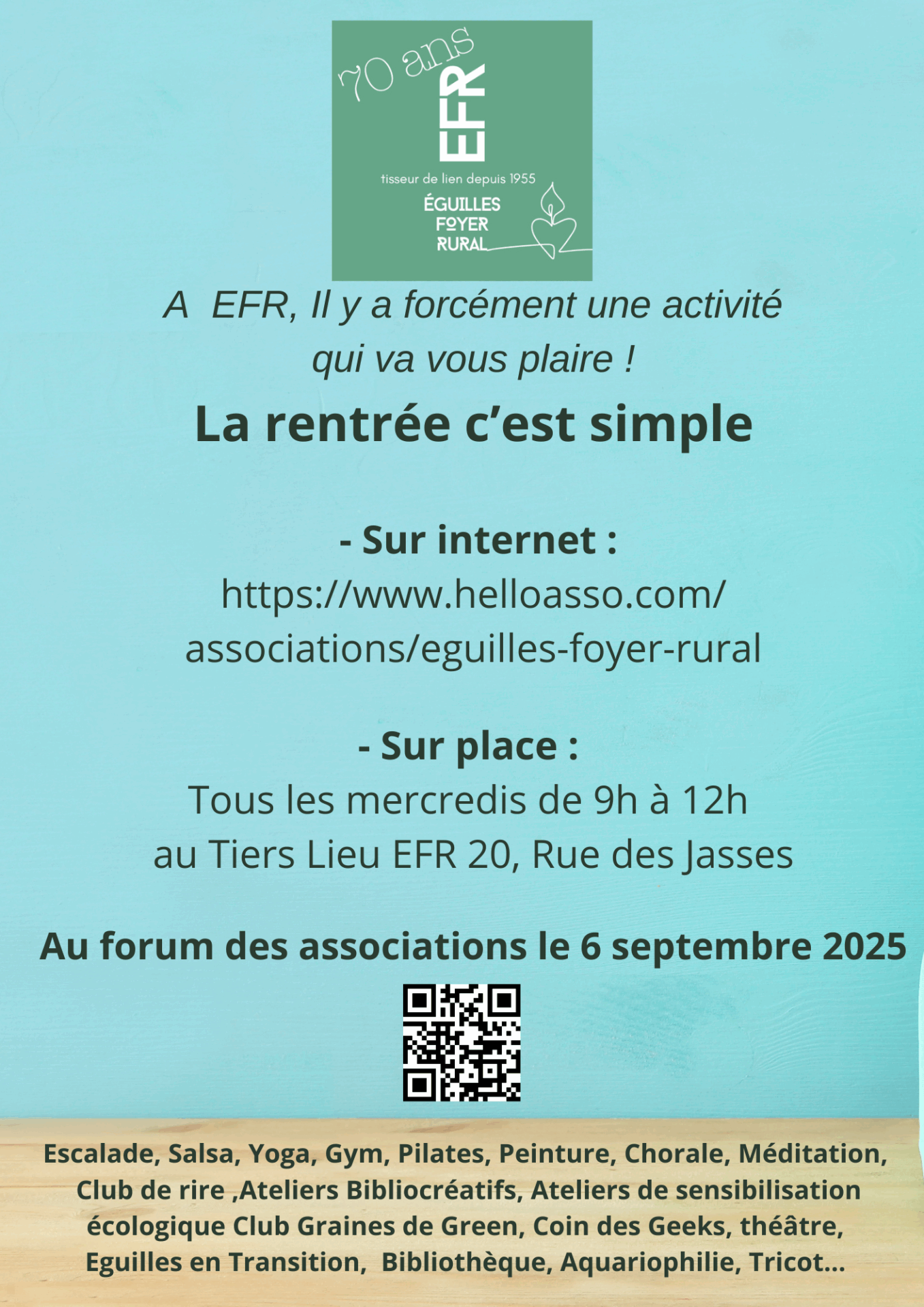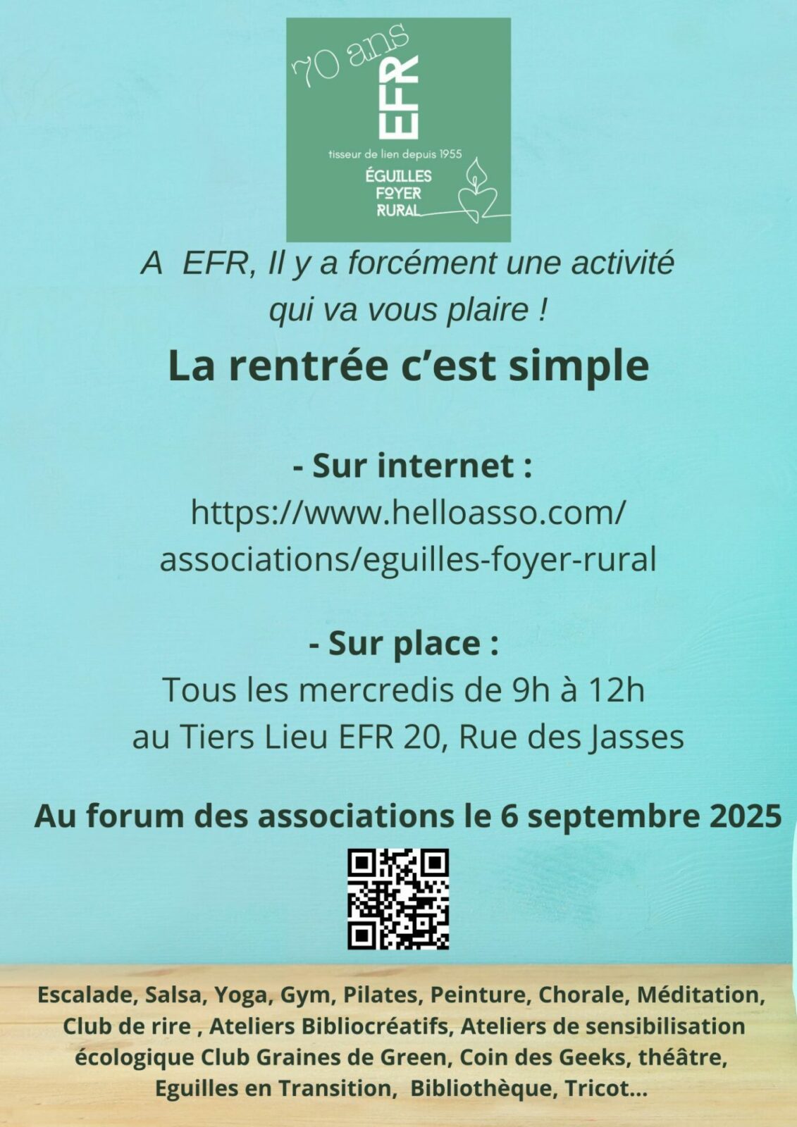 Yoga : https://www.helloasso.com/associations/eguilles-foyer-rural/adhesions/yoga-2025-2026