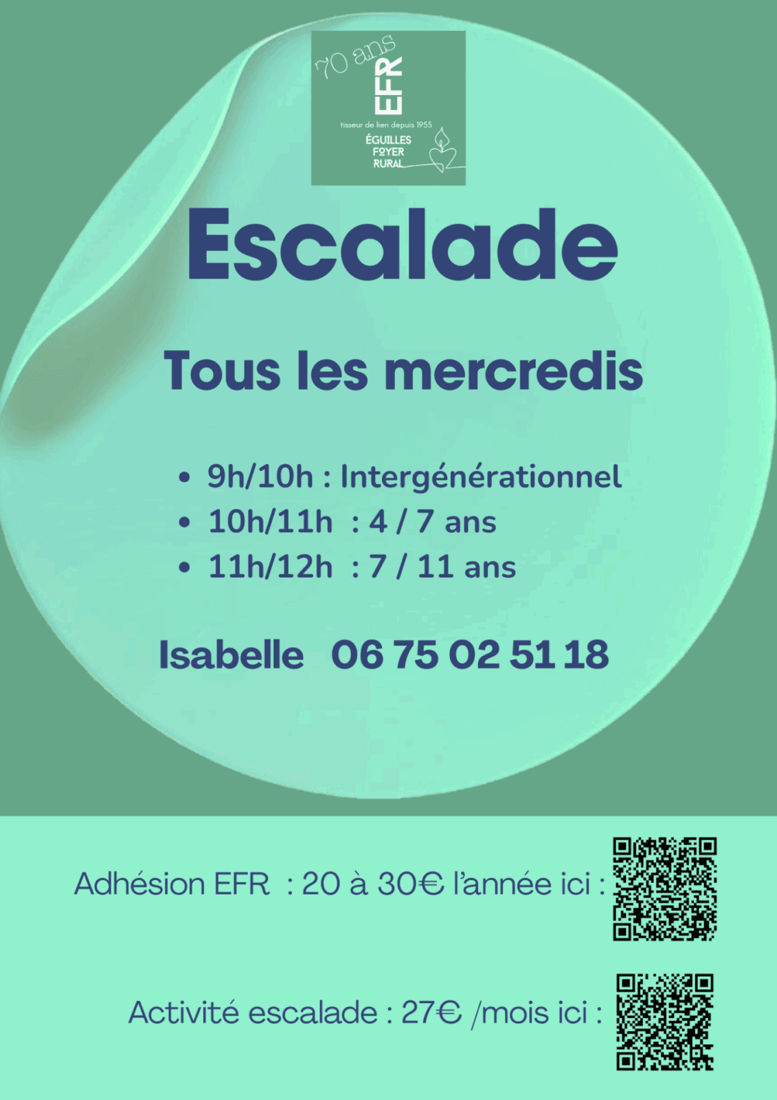 A partir de septembre, l’activité escalade vous est proposée le mercredi matin.