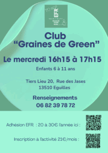 Le Club Graines de Green s’inscrit dans le projet associatif de EFR – Eguilles Foyer Rural. Il en partage les valeurs et les objectifs d’ouverture à la jeunesse, d’éducation populaire et d’écologie. Retrouvez toutes les informations de EFR Eguilles Foyer Rural sur les site  https://efr.foyersruraux.org/
