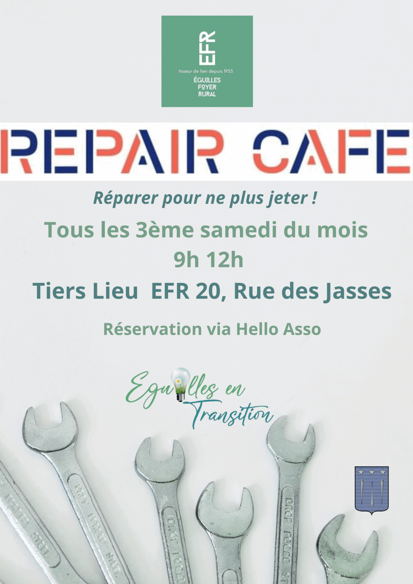 Avril : https://www.helloasso.com/associations/eguilles-foyer-rural/evenements/repair-cafe-du-18-avril-2025-9h-12h